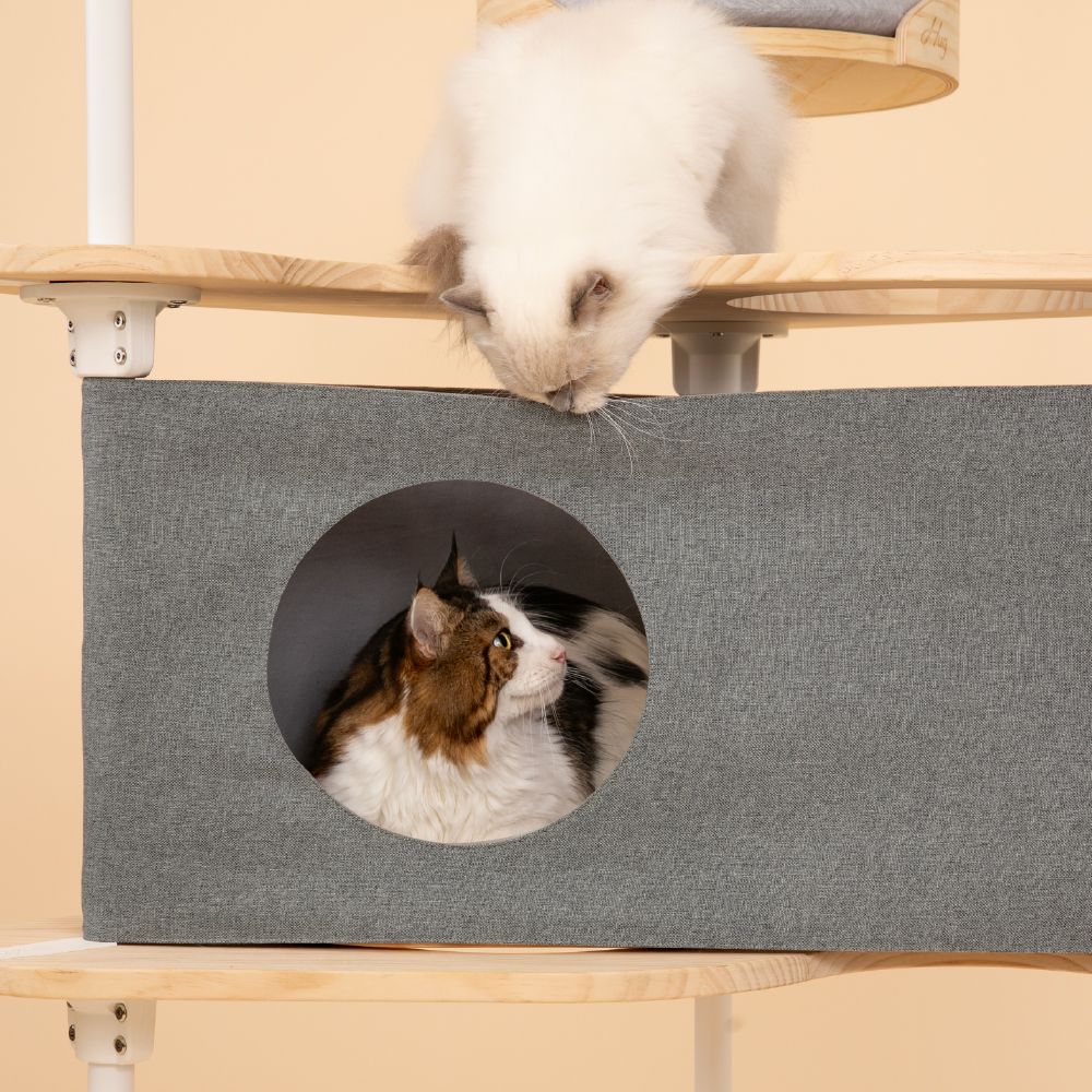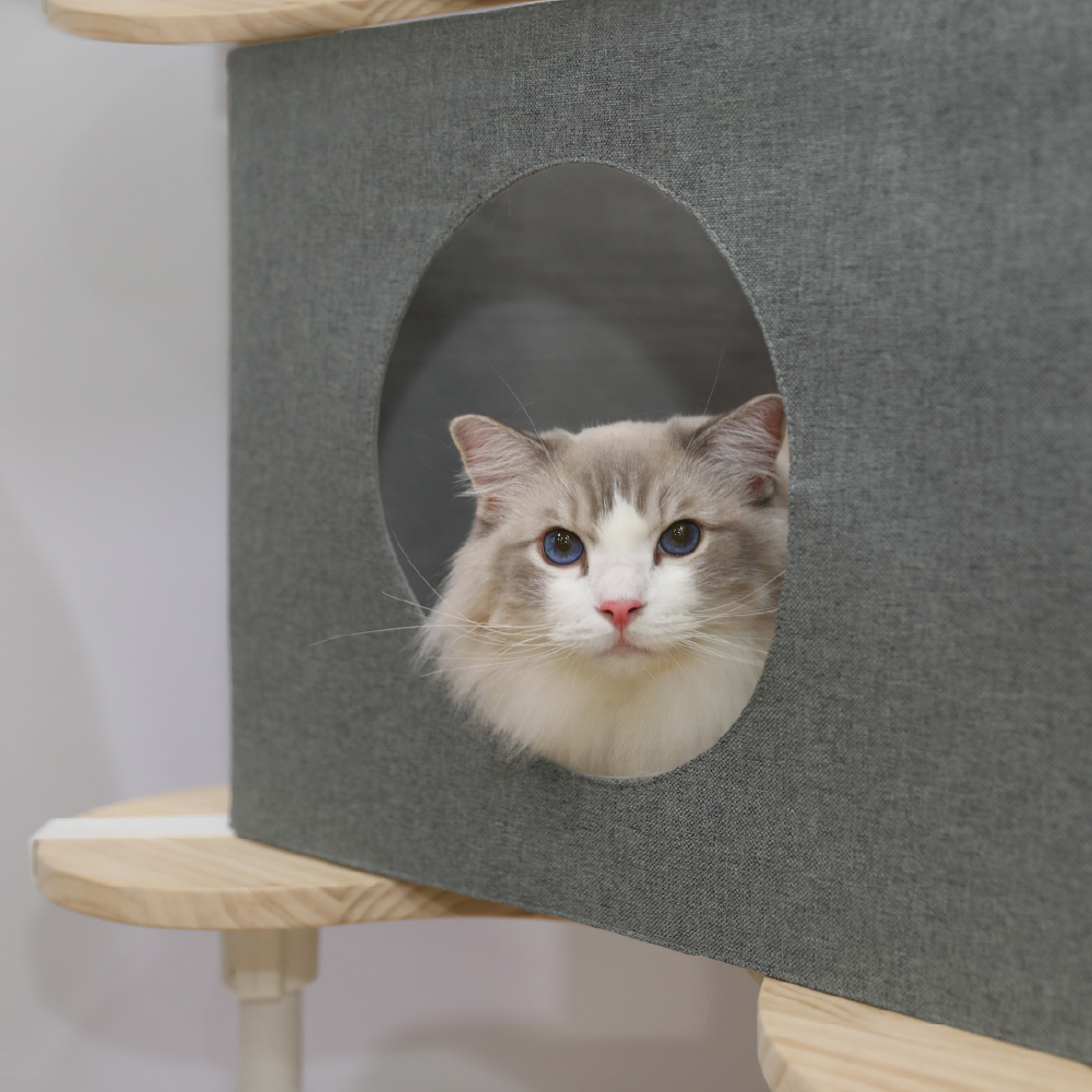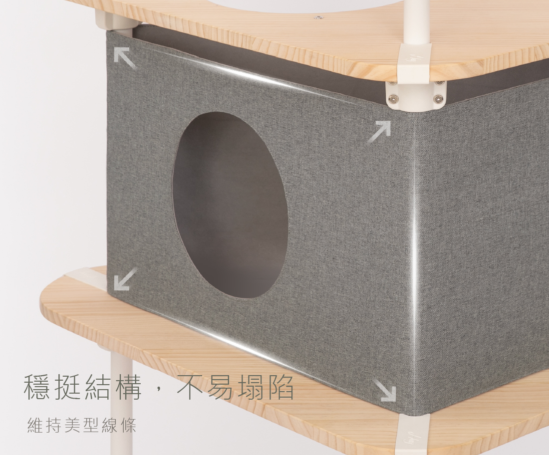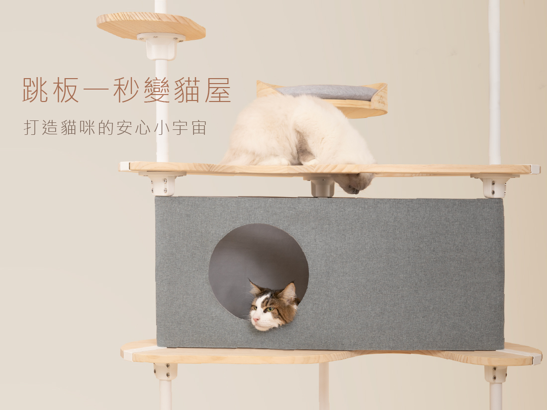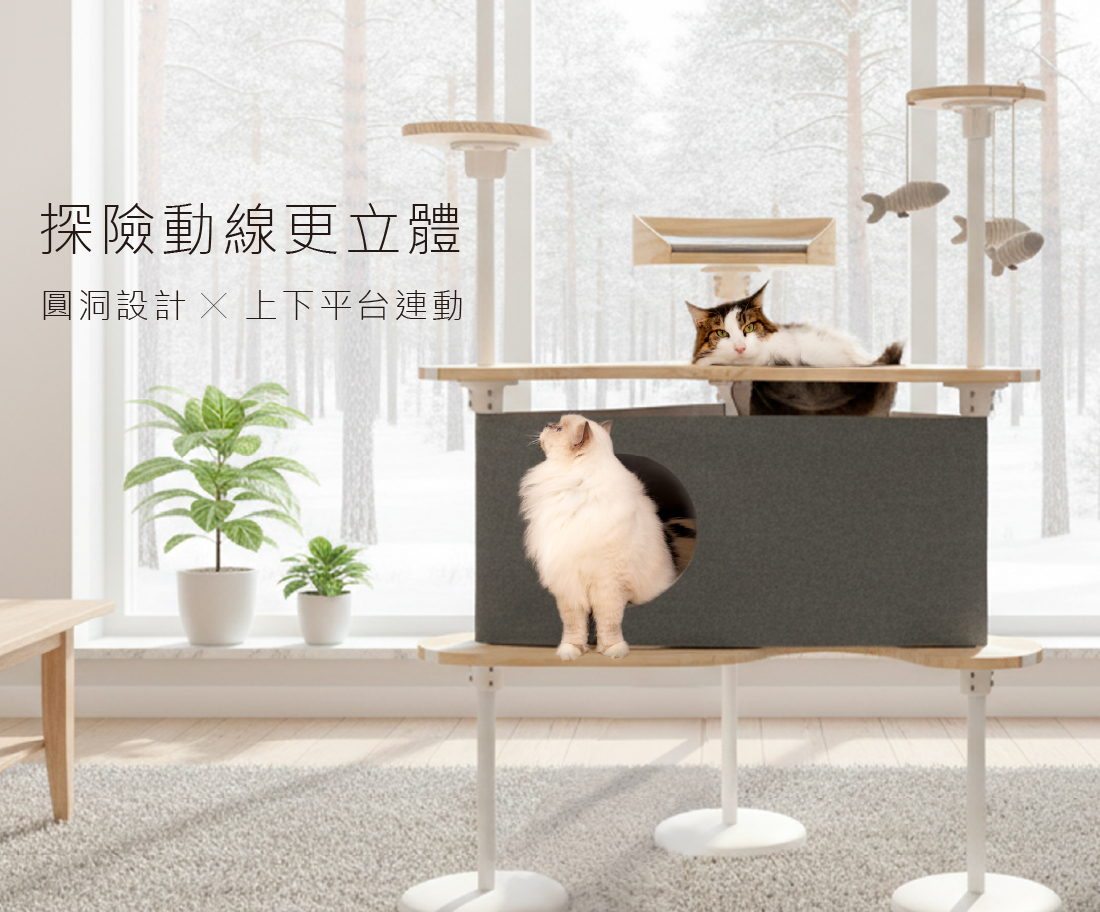 圓洞設計與上下三角跳板串連的動線,讓貓咪能自由進出,穿梭、窺探、遊戲,滿足探索天性。非單一出入口也能提供多貓家庭的貓咪更多路線選擇。